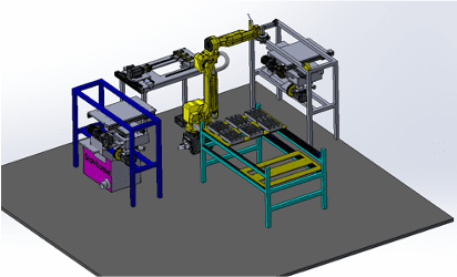 Robotcelle for sveising av deler hos Pretec. Totalt 7 palleplasser roboten kan hente/levere på. Roboten henter deler ved hjelp av vision på pall. Roboten holder delene på plass i en to-akset manipulator, mens sveiseroboten søker seg inn på fuga med en fugefølgingslaser og sveiser sammen delene